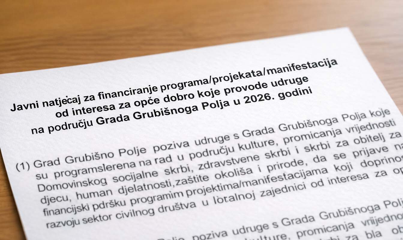 Grad Grubišno Polje je objavio Javni natječaj za financiranje programa i projekata od interesa za opće dobro koje provode udruge na području Grada u ovoj godini. Osma je to godina kako se sukladno zakonskim odredbama tim putem raspodjeljuje proračunski novac udrugama koje djeluju na području grada. Riječ je o dobroj prilici da grubišnopoljske udruge dođu do dijela od ukupno, sada 82.000 eura, koliko je u gradskom proračunu predviđeno za njihov rad u ovoj godini, a taj je iznos 10.000 eura veći nego lani. Stoga Grad poziva udruge, da se prijave i ostvare financijsku podršku svojim programima odnosno projektima koji doprinose razvoju sektora civilnog društva u lokalnoj zajednici od interesa za opće dobro. Najmanji iznos koji se po jednom projektu može odobriti i ugovoriti je 200 eura, a najveći 3000 eura. Svaka udruga može prijaviti i ugovoriti najviše dva programa za jedno ili više područja Javnog natječaja za razdoblje provedbe do 31. prosinca 2026. godine. Sva pitanja vezana uz natječaj mogu se postaviti isključivo elektroničkim putem, slanjem upita na sljedeću adresu: grad@grubisnopolje.hr i to najkasnije 15 dana prije isteka natječaja sukladno Uputama za prijavitelje na Javni natječaj za financiranje programa i projekata od interesa za opće dobro na području Grada Grubišnoga Polja u 2026. godini. Udruge projekte mogu prijaviti do 16. travnja ove godine. Lani su iz gradskog proračuna udrugama isplaćena 72.000 eura. Dokumentaciju preuzmite na POVEZNICI